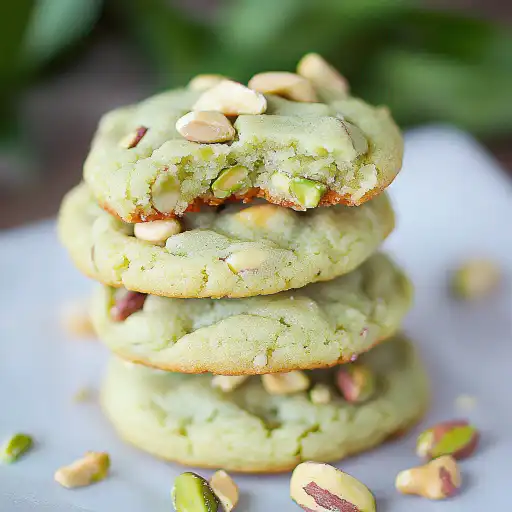 Step 1: In a medium bowl, whisk together the all-purpose flour, instant pistachio pudding mix, baking soda, and salt. This ensures that the dry ingredients are evenly distributed, which is crucial for the cookie’s texture. Set the bowl aside. Step 2: In a large mixing bowl, cream together the softened unsalted butter, light brown sugar, and granulated sugar using an electric mixer. Beat until the mixture is light and fluffy, about 3 to 5 minutes. This step is important for incorporating air into the dough, which will contribute to a soft and airy texture. Step 3: Add the room temperature egg and clear vanilla extract to the creamed mixture. Beat until well blended. Make sure the egg is at room temperature as it emulsifies better with the butter and sugar, creating a smoother dough. Step 4: Gradually stir in the dry ingredients (flour mixture) into the wet ingredients until just combined. Be careful not to overmix, as this can develop the gluten in the flour and result in a tough cookie. If you desire a deeper green color, add a few drops of green or blue food coloring (optional) and mix until the dough is evenly tinted. Step 5: Gently fold in the white chocolate chips and chopped pistachios until they are evenly distributed throughout the dough. The white chocolate chips add sweetness and creaminess, while the pistachios provide a nutty flavor and a satisfying crunch. Step 6: Cover the dough with plastic wrap and refrigerate for at least 30 minutes. This chilling period allows the flavors to meld together and prevents the cookies from spreading too much during baking. Step 7: Preheat your oven to 325°F (160°C). Line a baking sheet with parchment paper or lightly grease it to prevent the cookies from sticking. Step 8: Scoop out rounded tablespoons of cookie dough and place them onto the prepared baking sheet, leaving some space between each cookie to allow for spreading. Step 9: Bake for 12-14 minutes, or just until the edges are set and the centers are still slightly soft. Be careful not to overbake, as these cookies are best when they are soft and chewy. If you see any browning, pull them out. Step 10: Remove the baking sheet from the oven. While the cookies are still warm, gently press a few extra white chocolate chips into the top of each cookie for a more attractive presentation. Step 11: Let the cookies cool on the baking sheet for several minutes before transferring them to a wire rack to cool completely. This will prevent them from breaking apart while they are still soft.