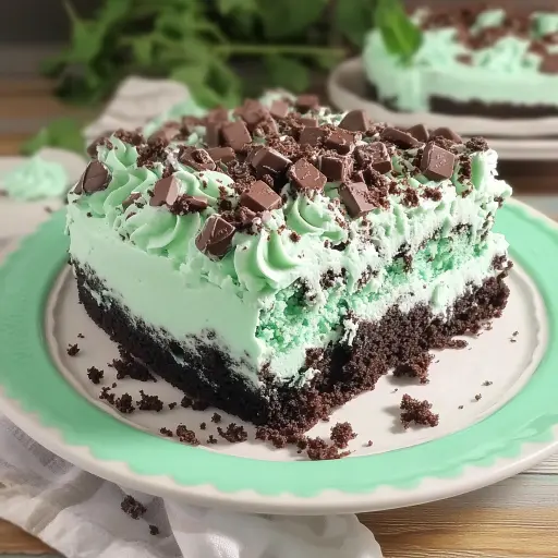 A: While you can freeze this cake, the texture of the whipped topping might change slightly upon thawing. It’s best to freeze the cake without the whipped topping and garnish. Thaw completely in the refrigerator, then add the whipped topping and mint chocolate candy before serving.