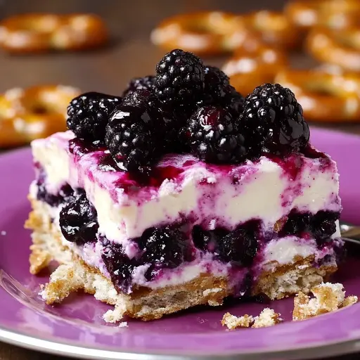 Step 16: Garnish: Garnish with fresh blackberries and pretzel pieces, if desired. This enhances the visual appeal of the dessert and adds a hint of salty and sweet flavor.