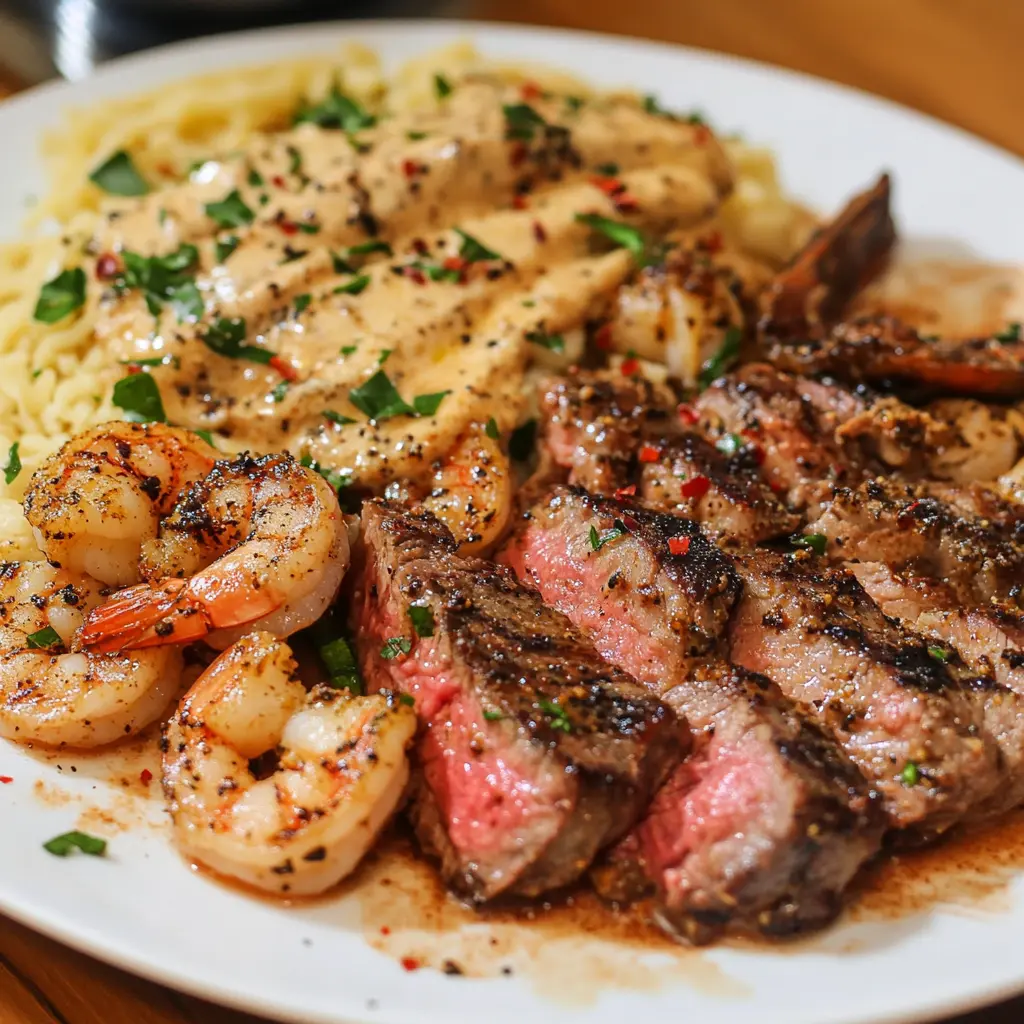 This Cajun Shrimp and Steak recipe is a mouthwatering combination of juicy, perfectly seasoned ribeye or sirloin steaks paired with succulent Cajun-spiced shrimp. The rich flavors of the Cajun seasoning, combined with the tenderness of the steak, create a dish that is both indulgent and satisfying. Perfect for a special dinner or a weekend gathering, this recipe brings the bold taste of Southern cuisine right to your kitchen.