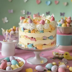 Description: This Easter Trifle is a visually stunning and deliciously layered dessert perfect for your spring celebrations. Pastel-colored cake cubes …