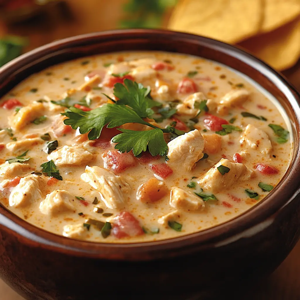 Return the shredded chicken to the crockpot and stir well to combine all the ingredients. If desired, garnish with chopped fresh cilantro before serving hot. Enjoy the delightful warmth of this creamy chili in every spoonful!