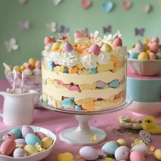 Description: This Easter Trifle is a visually stunning and deliciously layered dessert perfect for your spring celebrations. Pastel-colored cake cubes are combined with creamy pudding and fluffy whipped topping, then adorned with festive decorations like mini chocolate eggs and edible flowers. It’s an easy-to-make dessert that’s sure to impress your guests!
