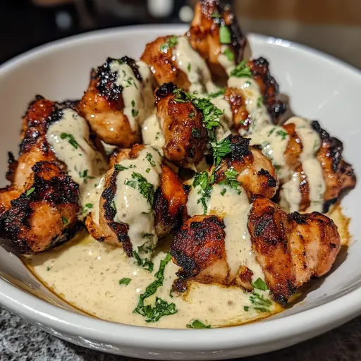 This recipe is a crowd-pleaser that combines simplicity with gourmet flavors. The chicken bites are easy to prepare and cook quickly, making them ideal for busy weeknights or last-minute entertaining. The creamy garlic sauce is not only delicious but also versatile, perfect for dipping or drizzling. Plus, the dish is customizable; you can adjust the spices to suit your taste, making it suitable for everyone at the table. Whether you’re serving it as an appetizer or a main course, these grilled chicken bites will leave your guests raving about your culinary skills!