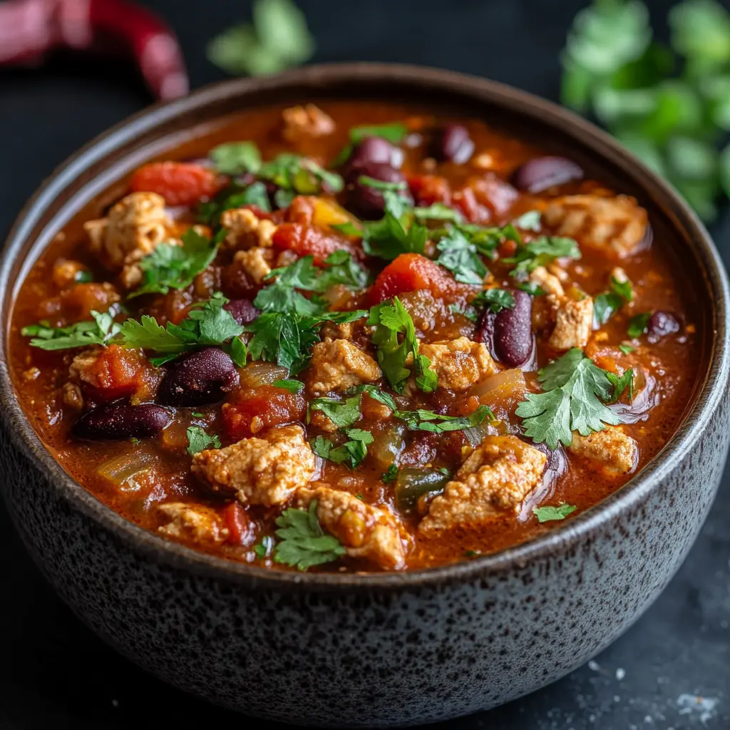 Step 5: Once heated through and the flavors have melded, serve your turkey chili hot, garnished with fresh cilantro for an extra burst of flavor and color.