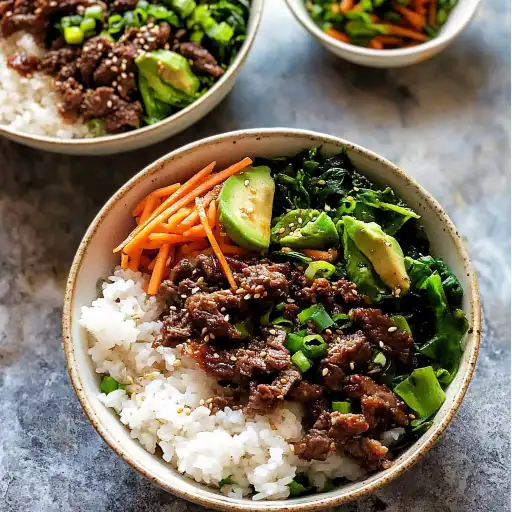Korean Beef Bulgogi Rice Bowls are a symphony of savory, sweet, and slightly tangy flavors, all harmonizing in one satisfying dish. This recipe transforms humble ground beef into a delectable bulgogi, infused with a complex sauce that’s both easy to make and deeply flavorful. Served over a bed of fluffy rice and accompanied by an array of fresh and pickled vegetables, creamy avocado, and a drizzle of umami-rich sauce, these bowls are a culinary adventure in every bite. They’re perfect for a quick weeknight dinner, a fun lunch, or even a casual gathering with friends. The recipe is highly customizable, allowing you to tailor the ingredients to your personal preferences and dietary needs. Whether you’re a seasoned cook or a beginner in the kitchen, these Korean Beef Bulgogi Rice Bowls are sure to become a new favorite.