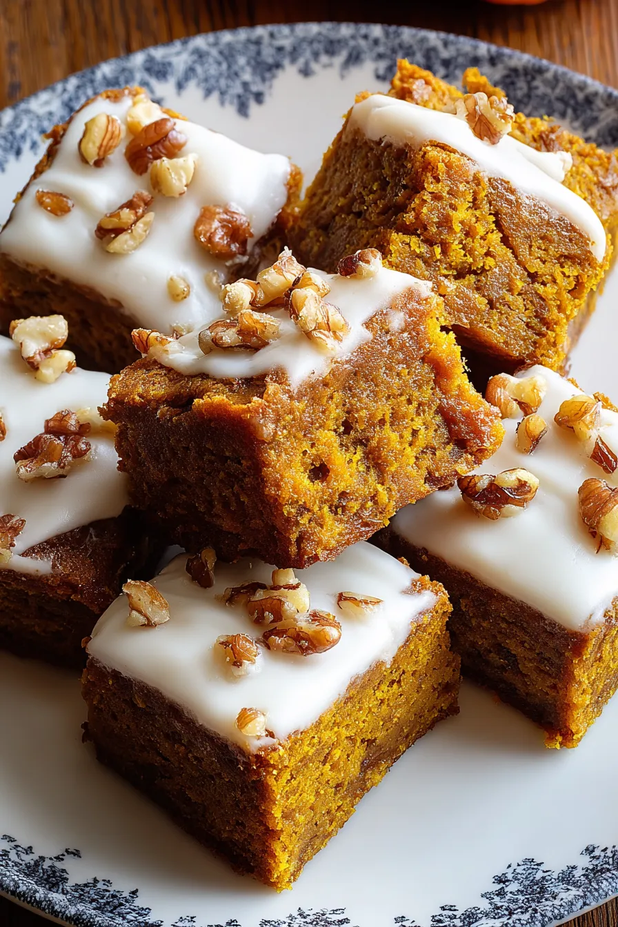 A: Yes, you can freeze these pumpkin bars for up to 2-3 months. It’s best to freeze them unfrosted, as the frosting may become soggy or change texture when thawed. Wrap the cooled bars tightly in plastic wrap, then place them in an airtight container or freezer bag. When ready to serve, thaw the bars in the refrigerator overnight and then frost them. If you want to freeze frosted bars, freeze them individually on a baking sheet until solid, then wrap them in plastic wrap and store them in a freezer bag.