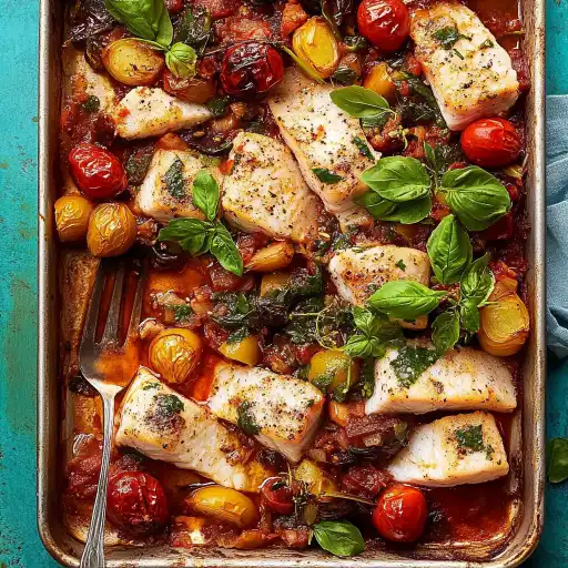 This Puttanesca Fish Tray Bake is a vibrant and flavorful one-pan meal that’s perfect for a weeknight dinner or a relaxed weekend gathering. It combines tender fish fillets with a zesty and aromatic puttanesca sauce, roasted potatoes, and fresh herbs. The result is a Mediterranean-inspired dish that’s both satisfying and easy to prepare. The beauty of this recipe lies in its simplicity: everything cooks together in one tray, minimizing cleanup and maximizing flavor. The robust puttanesca sauce, with its combination of tomatoes, olives, capers, anchovies, and garlic, infuses the fish and potatoes with a delectable savory depth.