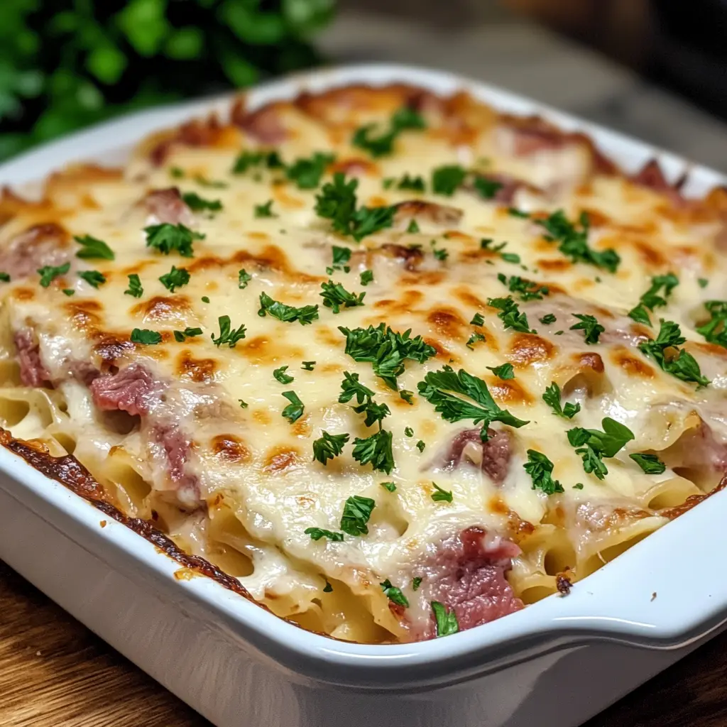 This Reuben Bake is a delightful twist on the classic Reuben sandwich, transforming its beloved flavors into a comforting layered casserole. With tender layers of corned beef, tangy sauerkraut, and melty Swiss cheese, all enveloped in a creamy white sauce and a zesty Thousand Island dressing, this dish is sure to be a hit at your next gathering.