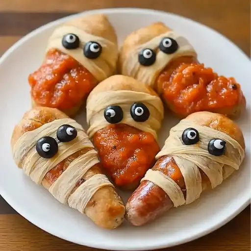 Your Sausage Mummies are now ready to be served! Arrange them on a platter or serving dish and present them to your eagerly awaiting guests. They can be enjoyed warm or at room temperature, making them a versatile snack option for any occasion. Serve them with a variety of dipping sauces, such as ketchup, mustard, barbecue sauce, or your favorite dips, to enhance their flavor and appeal.